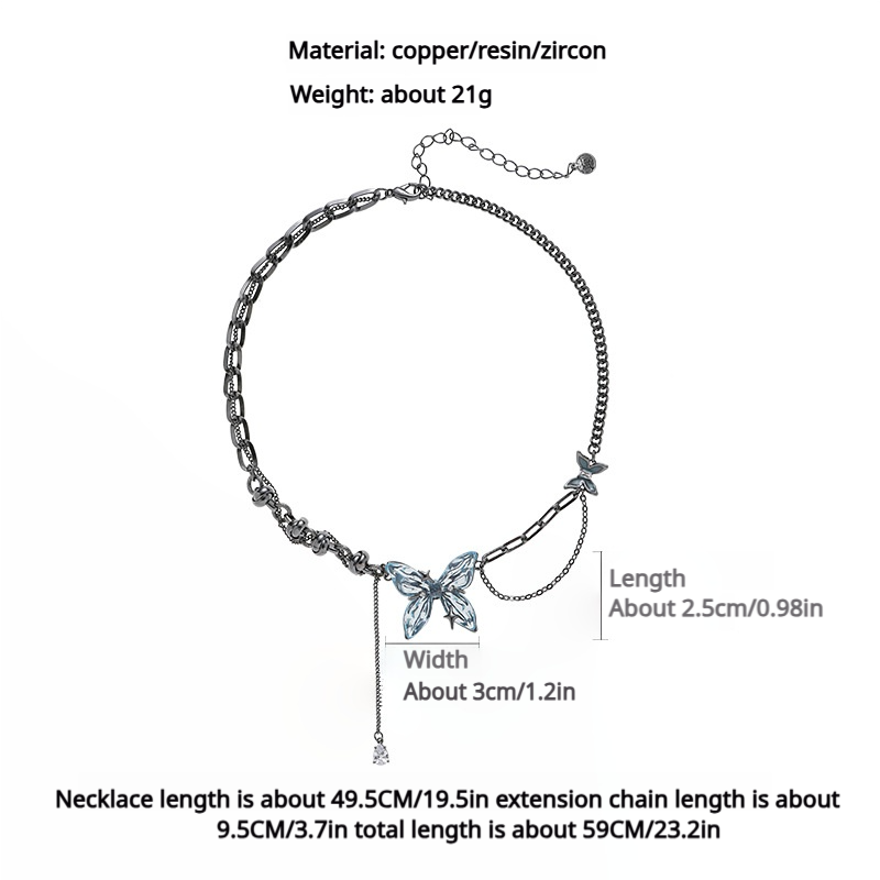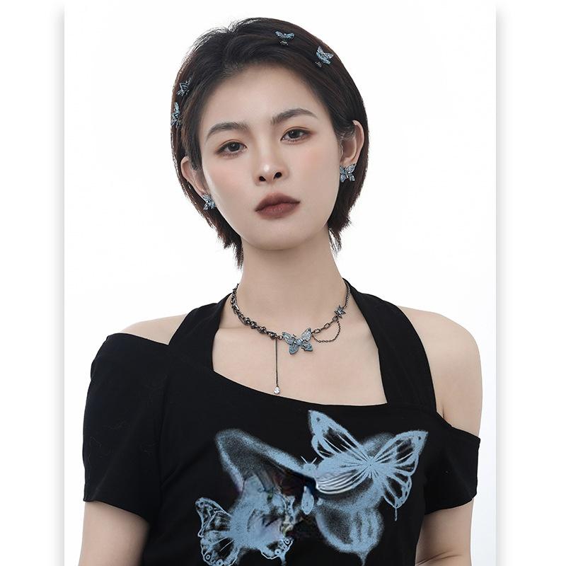 This Blue Butterfly Jewelry Set includes a necklace, earrings, a ring, and a hair clip. Crafted from copper, resin, and zirconia, with 925 sterling silver needles in earrings for comfort. Each piece features a stunning blue design, perfect for adding a touch of elegance and whimsy to any look. The set offers a variety of accessories to complement different styles, from daily wear to special occasions.