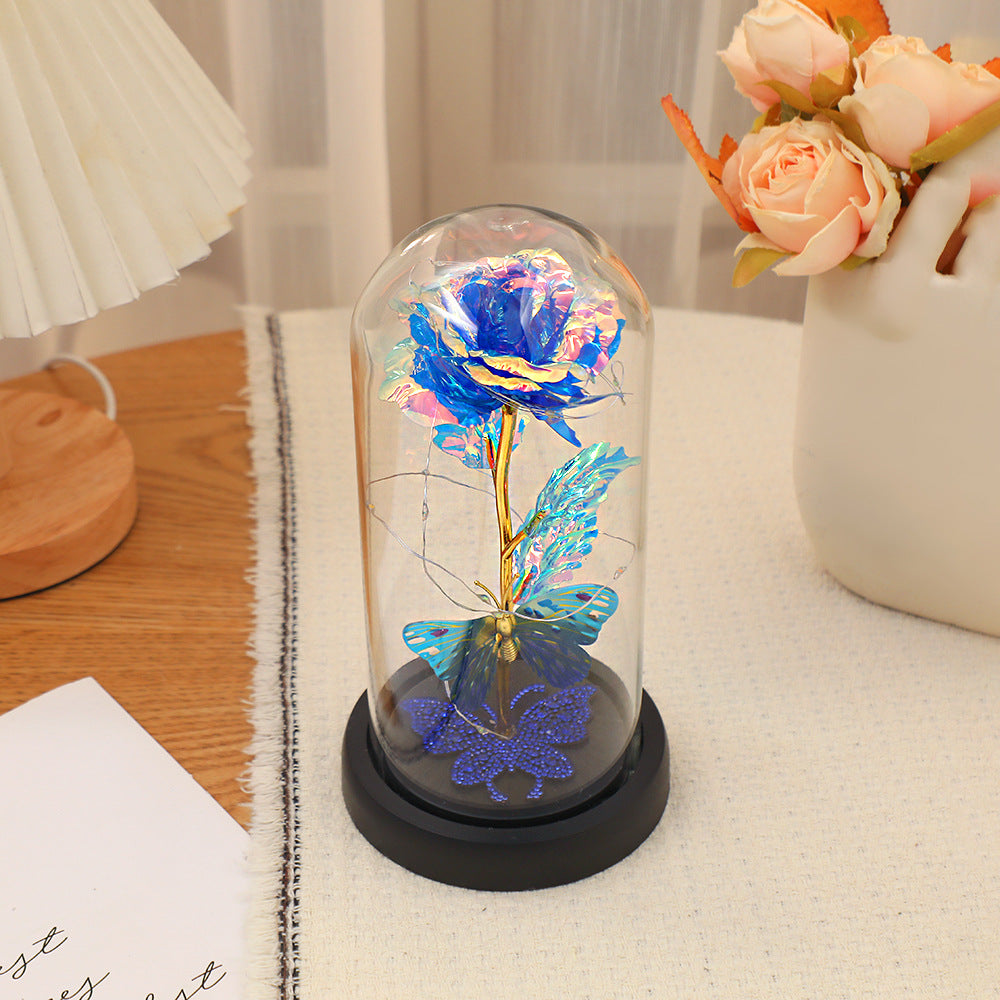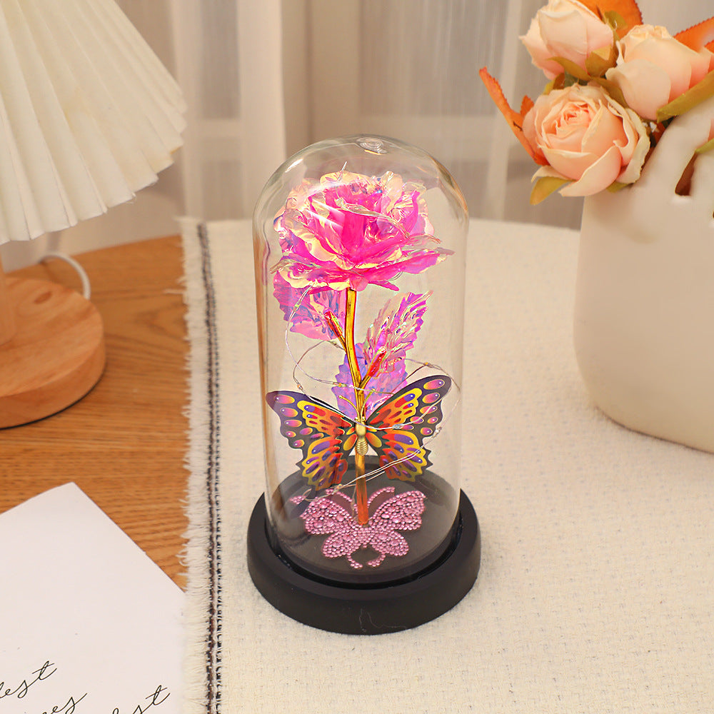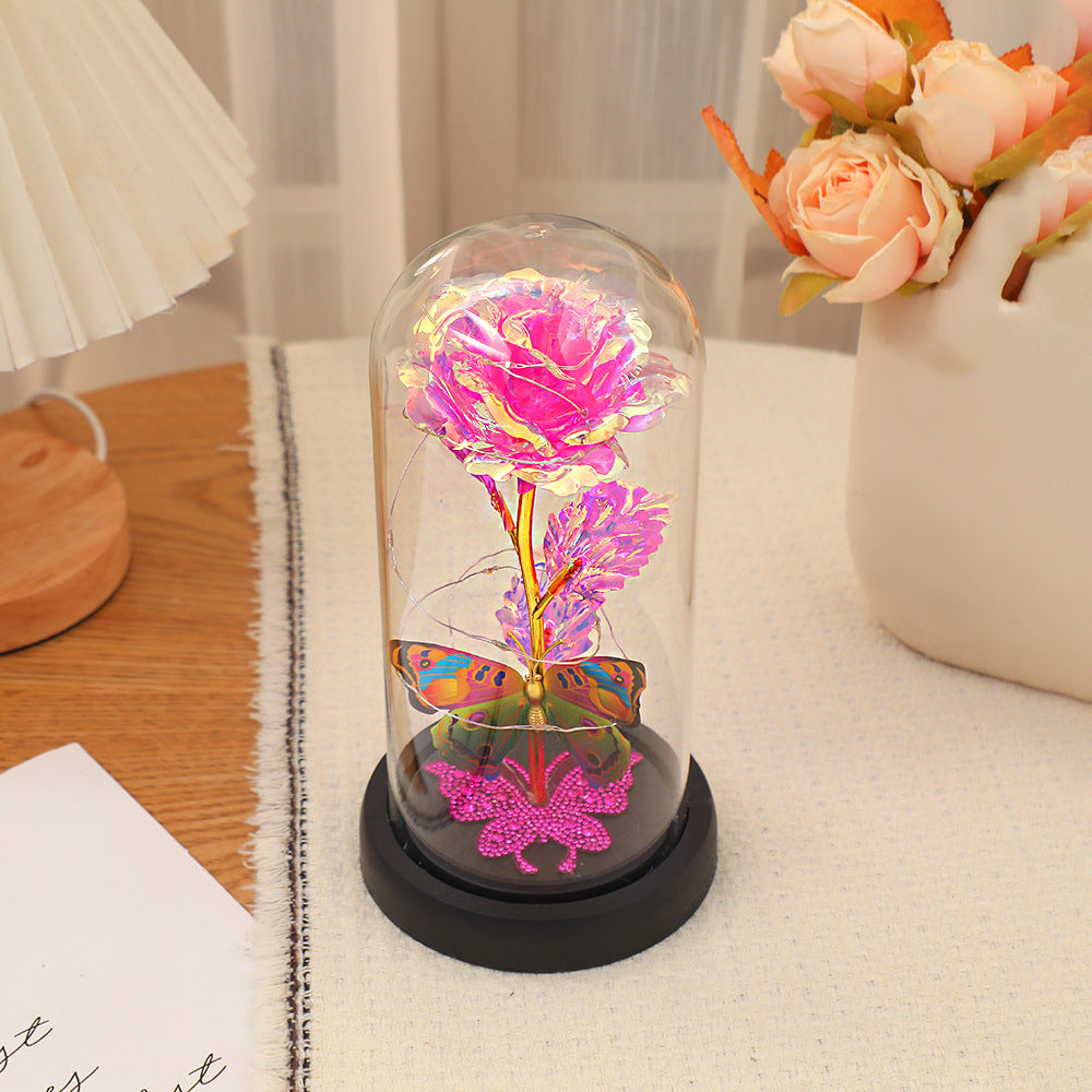 Dream Butterfly Rose Glass Cover Gift Box is a perfect combination of romance and fantasy. The glass cover is made of high borosilicate glass, which is clear and transparent and perfectly presents the internal scenery. The base is made of logs, matched with plastic parts, and has been treated with fire color, with a unique texture. The built-in rose is made of Pet material, and the rod is plastic injection molded and electroplated with gold, with a bright color. The butterfly decoration is lifelike, and some are decorated with rhinestones, which are dazzling.